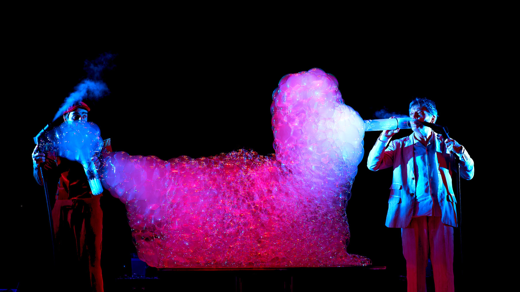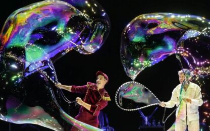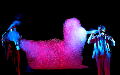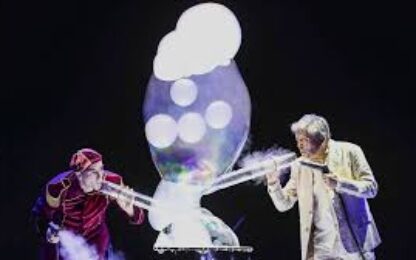 Un spectacle magique et aérien. Une jonglerie brillante où deux drôles de personnages incongrus manipulent, maîtrisent ou habitent des millions de petites ou d’énormes bulles.